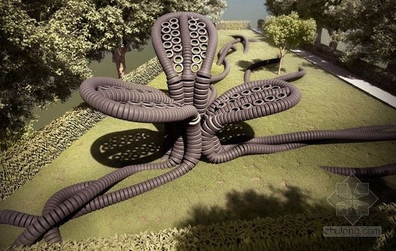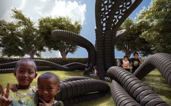 根據(jù)Recycling Revolution網(wǎng)站報(bào)道,美國(guó)客戶每年平均要丟棄22億個(gè)汽車輪胎,當(dāng)然這只是一個(gè)國(guó)家的廢棄量。而 AnneMarie van Splunter的概念性設(shè)計(jì)就是通過(guò)這些輪胎而打造出“橡膠樹”,這些輪胎為這個(gè)項(xiàng)目的主要材料并且通過(guò)堆積的方式來(lái)形成了這個(gè)作品。