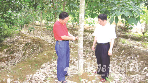 農場領導在察看橡膠樹長勢情況。